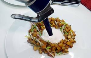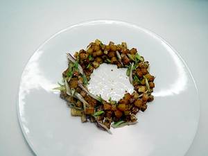 Auf großem, leicht angewärmten Teller den Bratkartoffelsalat mittig ringförmig anrichten.