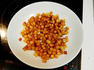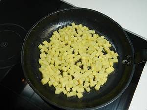 Die Kartoffeln schälen und so exakt wie möglich in Würfel von 2 cm Kantenlänge schneiden – evtl. Hobel mit breitester Einstellung oder Brotschneidemaschine zu Hilfe nehmen.