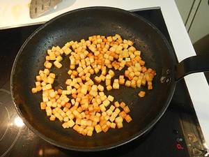 Fett in beschichteter Pfanne stark erhitzen, Kartoffeln zugeben, kurz durchschütteln und Hitze auf mittlere Stufe reduzieren.