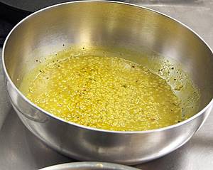 Perlgraupen in Salzwasser bis kurz vor al dente garen (also mit etwas zu viel Biss). Anschließend im Gewürzfond...