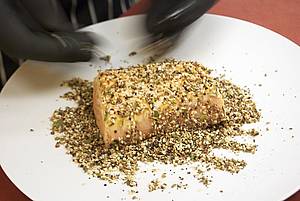 McMahon voll und ganz in seinem Crossover-Element: Den auf den Punkt gegarten Lachs paniert er in seiner eigenen Sesam-Gewürzmischung, die Perlgraupen bekommen Limetten-und Orangen-Frische, Curcumawurzeln und Korianderstiele bringen den Asia-Touch.