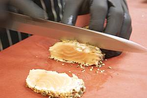 Direkt vor dem Servieren mit scharfem, dünnen Messer in 1-2 cm dünne Scheiben schneiden.
