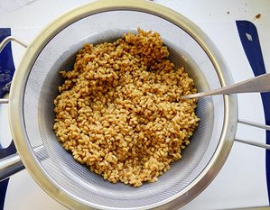 Instant-Dinkel in dem gewürzten Wasser (Menge exakt bemessen) und dem Fond kurz aufkochen und 20 Min. auf niedriger Hitze ausquellen lassen. Abseihen und 15 Min. abtropfen lassen.