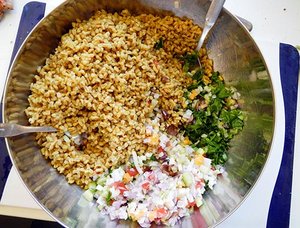 auf einem Bett Dinkel-Tabouleh-Salat. Mit etwas Sauce beträufeln
