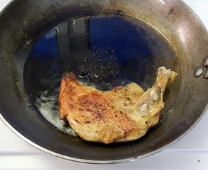 Perlhuhn-Supremes aus den Beuteln nehmen, Flüssigkeit auffangen und kurz mit der Butter verschlagen und zu Sauce aufkochen. Butterschmalz in unbeschichteter Eisenpfanne stark erhitzen und die Perlhuhn-Supremes auf beiden Seiten sehr kurz scharf anbraten.