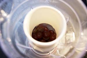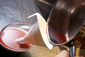 4 geeignete Gläser in schrägem Winkel aufbocken (z.B. auf breiten Teetassen oder kleinen Schüsseln). Heissen Traubensaft mit Trichter vorsichtig in die Gläser füllen.