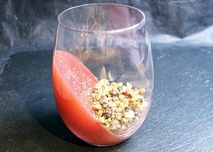 (alternativ im Mixer pürieren und durch sehr feines Sieb passieren – bei der Methode gelangen allerdings mehr Bitterstoffe aus den Schalen in den Saft, also evtl. etwas nachsüßen). Saft möglichst schnell auf 80 Grad erhitzen, vegetarische Gelatine (dadurch ist das Gericht auch für Vegetarier geeignet) mit Schneebesen einrühren (nicht mit Handmixer, es sollte kein Schaum entstehen), sofort vom Herd ziehen.