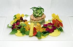 Saibling mit Gurken-Panna-Cotta, Blütensalat und Gin-Schaum