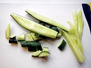 Salatgurkewaschen, längs vierteln und Kerne entfernen. Rest in grobe Teile schneiden
