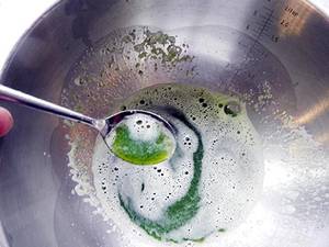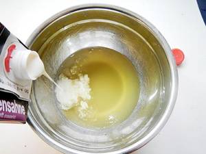 Gelatinepulver und Gelatine einrühren, kurz aufkochen und vom Herd nehmen. Unter stetigem Rühren abkühlen lassen, bis die Masse zu gelieren beginnt. Mit Schneebesen in die Gurkenflüssigkeit rühren.