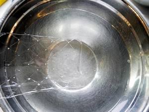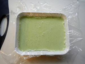 Masse in flache, mit Küchenfolie ausgelegte Form gießen und sofort in das unterste Fach des Kühlschrankes stellen.3 Stunden gelieren lassen.