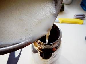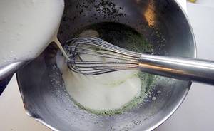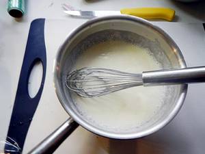 Sahne und Milch in Topf oder Sauteuse aufkochen und bei stetigem Rühren auf die Hälfte reduzieren.