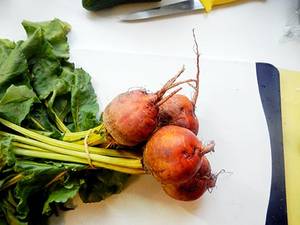 Aus Zitronensaft, Öl, Salz und Essig eine Vinaigrette anrühren, Bete-Scheiben durchschwenken,