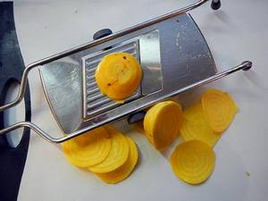 schälen, mittig teilen und auf scharfem Hobel in hauchdünne Scheiben hobeln.