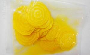 Vinaigrette abgießen, auffangen. Bete-Scheiben auf Krepp trocknen.