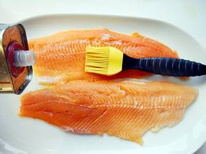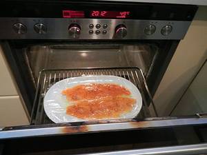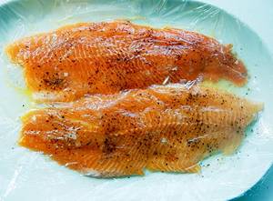 Backofen oder Kombidämpfer auf 60 Grad erhitzen (keine Umluft; exakt einstellbare Backöfen auf 49 Grad bringen). Mit Folie abgedeckten Teller hineinstellen und den Fisch erhitzen, bis er eine Kerntemperatur von 49 Grad hat (mit Thermometer nachmessen, dauert bei 60 Grad Ofenhitze ca. 20 Min. bei 49 Grad entsprechend länger).