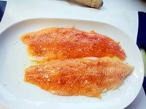 Fisch auflegen und mit dem Rest des Öls einpinseln. Mit Piment D’Espelette und Fleur de Selbestreuen.
