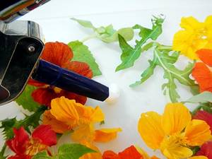 Vor dem Servieren den Wildblütensalat waschen, trocken schleudern, kurz durch die Bete-Marinade ziehen und auf Krepp leicht antrocknen.