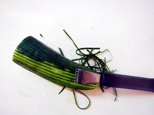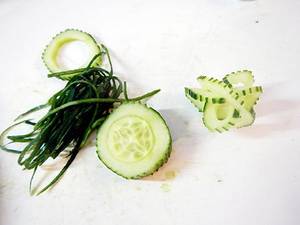 Mit Zestenreißer aus der Haut der Gurke lange dünne Streifen abziehen.