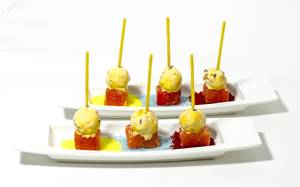 Eiskugeln aus dem Tiefkühler nehmen, rasch arbeiten. Holzspießchen (oder entsprechend zugeschnittene rohe Spaghetti) abwechselnd mit Eiskugeln und Grapefruitwürfeln bestecken, sofort servieren.