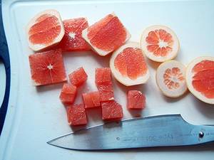 Abschnitte entsaften, Saft anderweitig verwenden. Grapefruitwürfel. von allen Seiten einsalzen,
