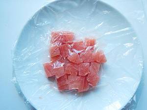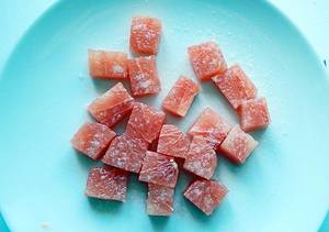 Früchte quadratisch zuschneiden, daraus Würfel von der Kantenlänge des Durchmessers der Eis-Halbkugelform schneiden (ca. 1,5 cm – Fruchtwürfel und Eiskugeln sollten gleich groß werden).