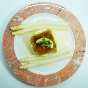 Dieses Rezept für Spargel in vier Aggregatszuständen bedient sich der Grundtechniken des Garens in Wasser: Zunächst wird ohne Salzzugabe der komplette Putz-Abfall, also die Schalen und die abgeschnittenen Stangen-Enden (sofern sie nicht dunkel oxidiert sind) in einem großen Topf zu einer Brühe ausgekocht. Die durch die Zubereitung mit Sahnesiphon himmlisch leichte Hollandaise bekommt durch Reduktion einer Flüssigkeitsmischung aus der besagten Spargelbrühe mit Wein, Essig, Gemüsefond und frischem Estragon Druck, das Püree kann durch Einsatz eines Themomix fast komplett aus gekochtem Spargel hergestelllt werden – und auch der Kern des panierten Schnitzels (Geflecht aus Spargelstreifen) wurde zunächst in der Brühe kurz blanchiert – ebenfalls eine Variante des Wassergarens – bevor er zur Bindung beidseitig mit Käse gratiniert und abschließend als Cordon Bleu paniert und gebraten wird.