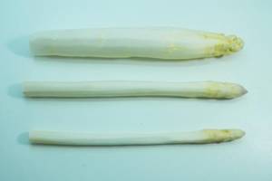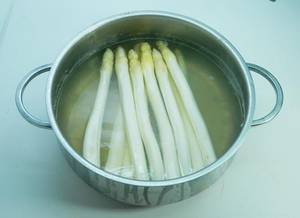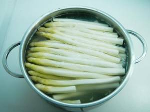 die Enden abschneiden, alle Stangen schälen. Schalen und Enden (sofern nicht braun angelaufen) in einem großem Topf mit mindestens 4 Liter ungesalzenem Wasser (besser: demineralisiertem Wasser) 20 Min. auskochen.