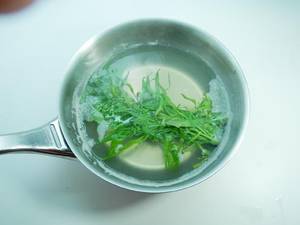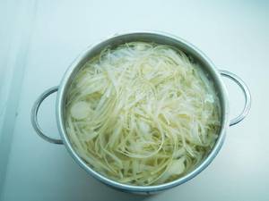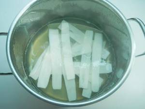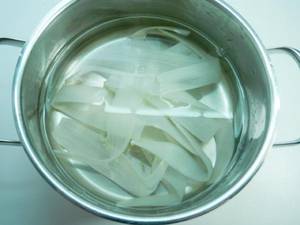 3 Liter Spargelkochwasser mit Salz, Zucker und Essig aufkochen, Streifen 1 Min. darin blanchieren,