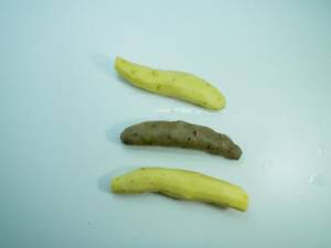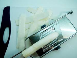 Für die Cordon Bleus die ganz dicken Stangen am Kopf abschneiden, längs halbieren und auf einem scharfen Hobel (oder einer Brotschneidemaschine) von der Anschnittseite aus 2 mm dünne Streifen schneiden.