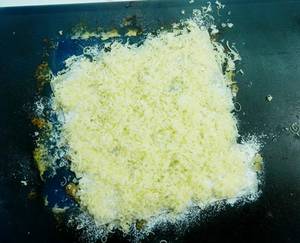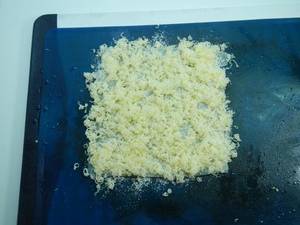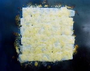 Gitter mit etwas Mehl bestäuben. Käse auf extrem scharfer Reibe zu feinem Schnee reiben, Gitter mit der Hälfte des Käses gleichmäßig bestreuen.