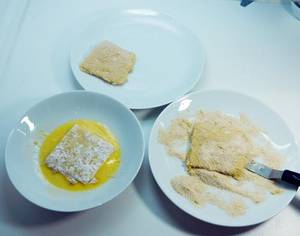 Gitter in vier gleich große Rechtecke schneiden. Beidseitig mehlieren und in dem verquirlten Ei und den Semmelbröseln panieren, Panierung gut festdrücken.