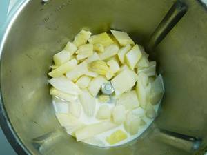 in Stücke schneiden und im Mixer mit der Sahne und der Butter zu einer möglichst glatten Creme pürieren.