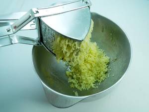 Falls das Püree zu fest wird, etwas Sahne zugeben. Ist es zu dünn, mit etwas Kartoffelstärke (oder Kartoffelpüreepulver) binden. Mit Pfeffer und Salz abschmecken