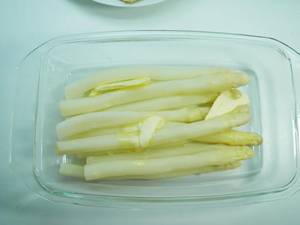 in flacher Schüssel mit Butter und 2 El Spargelkochwasser vermischen und abgedeckt warm stellen.
