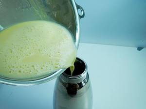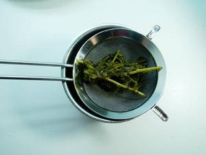 Abseihen, Flüssigkeit aufheben, Siebinhalt entsorgen.