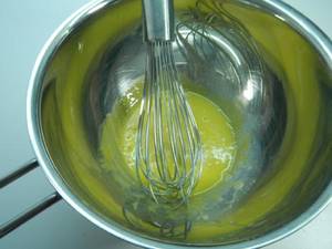 nach und nach die flüssige Butter unterschlagen. Die Temperatur darf 65 Grad nicht übersteigen, sonst flockt die Hollandaise aus.