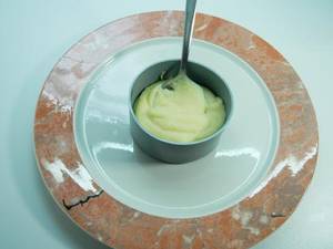 Auf gut vorgeheizte Teller mittig mit Servierring das Püree aufbringen.