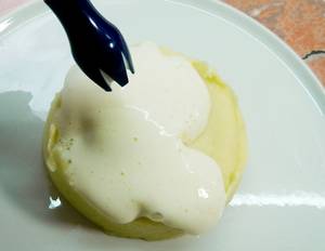 Vorsichtig die Hollandaise über das Püree spritzen (restliche Hollandaise in Sauciere spritzen und a part servieren).