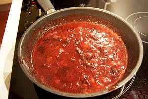 Mit dem Rest des Weins auffüllen und bei niedriger Temperatur ca. 20 Min. zu einer breiigen Konsistenz einkochen.