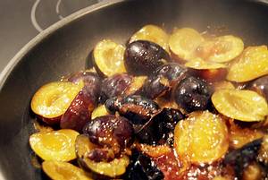 Mit der Hälfte des Pflaumenweins ablöschen, leicht einkochen lassen. Jetzt Pflaumen und Gewürze beigeben.