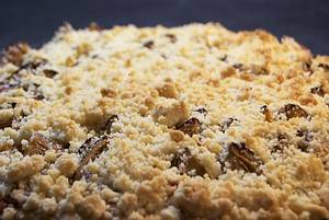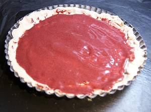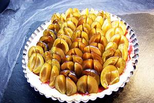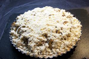 Teig ausrollen und in eine bemehlte flache Kuchenform drücken. Teigboden nicht einstechen. Pflaumenreduktion gleichmäßig aufstreichen.