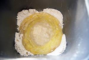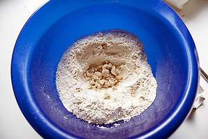 Das Mehl in eine große Schüssel sieben, eine Mulde in die Mitte drücken, dort die Hefe hinein bröseln.