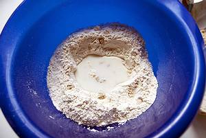 Milch darauf schütten und die Hefe mit Hilfe einer Gabel auflösen, nicht zuviel Mehl hineinrühren.