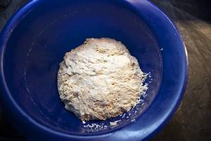 Schüssel mit Tuch bedeckt ca. 1 Stunde an warmen Ort stehen lassen. Der Teig in der Mitte (Vorteig) sollte nun leichte Risse an der Oberfläche zeigen. Jetzt die restlichen Zugaben in die Mitte der Schüssel geben und das Ganze zu einem trockenen Teig kneten, bis er sich von der Schüsselwand löst (geht auch mit Küchenmaschine).